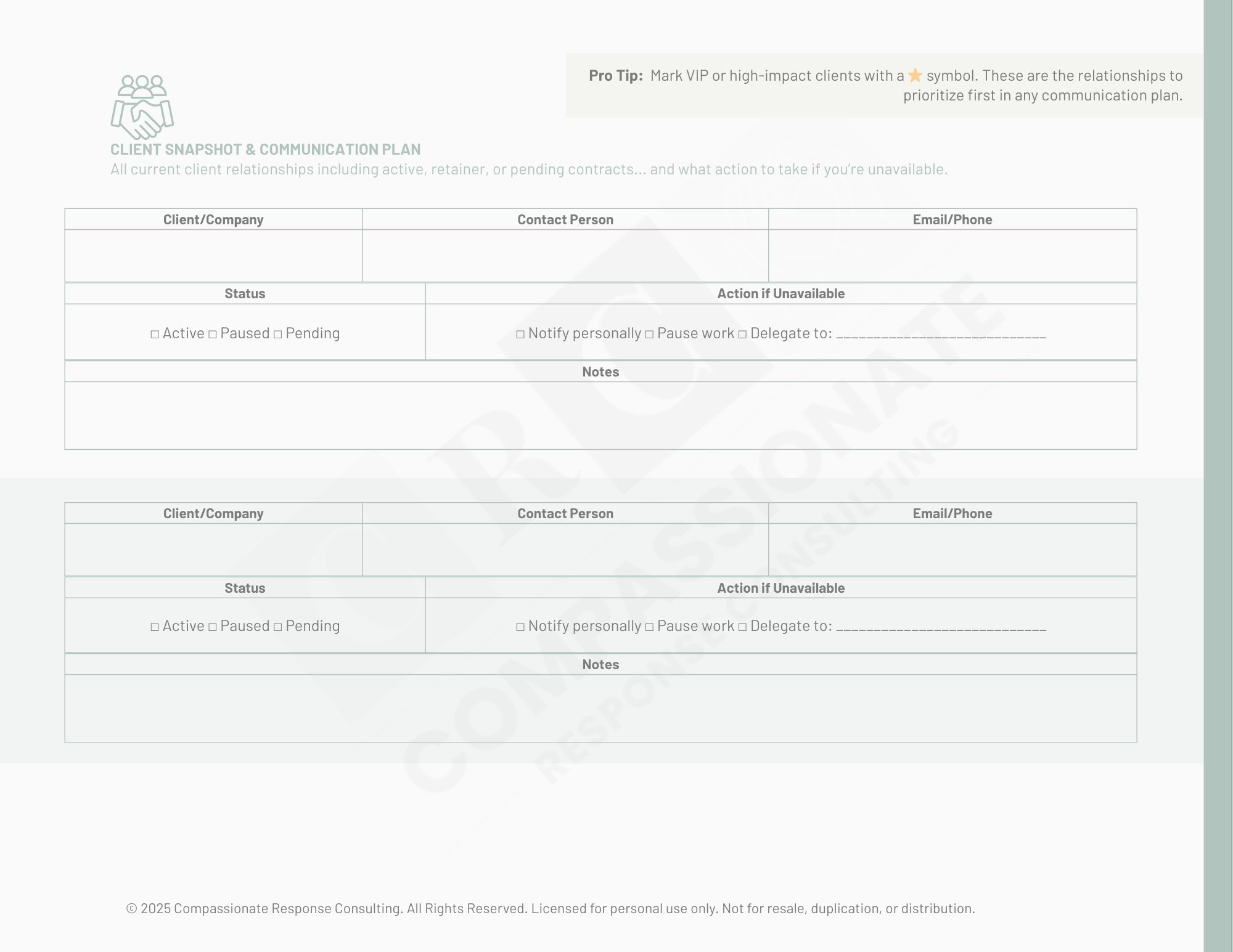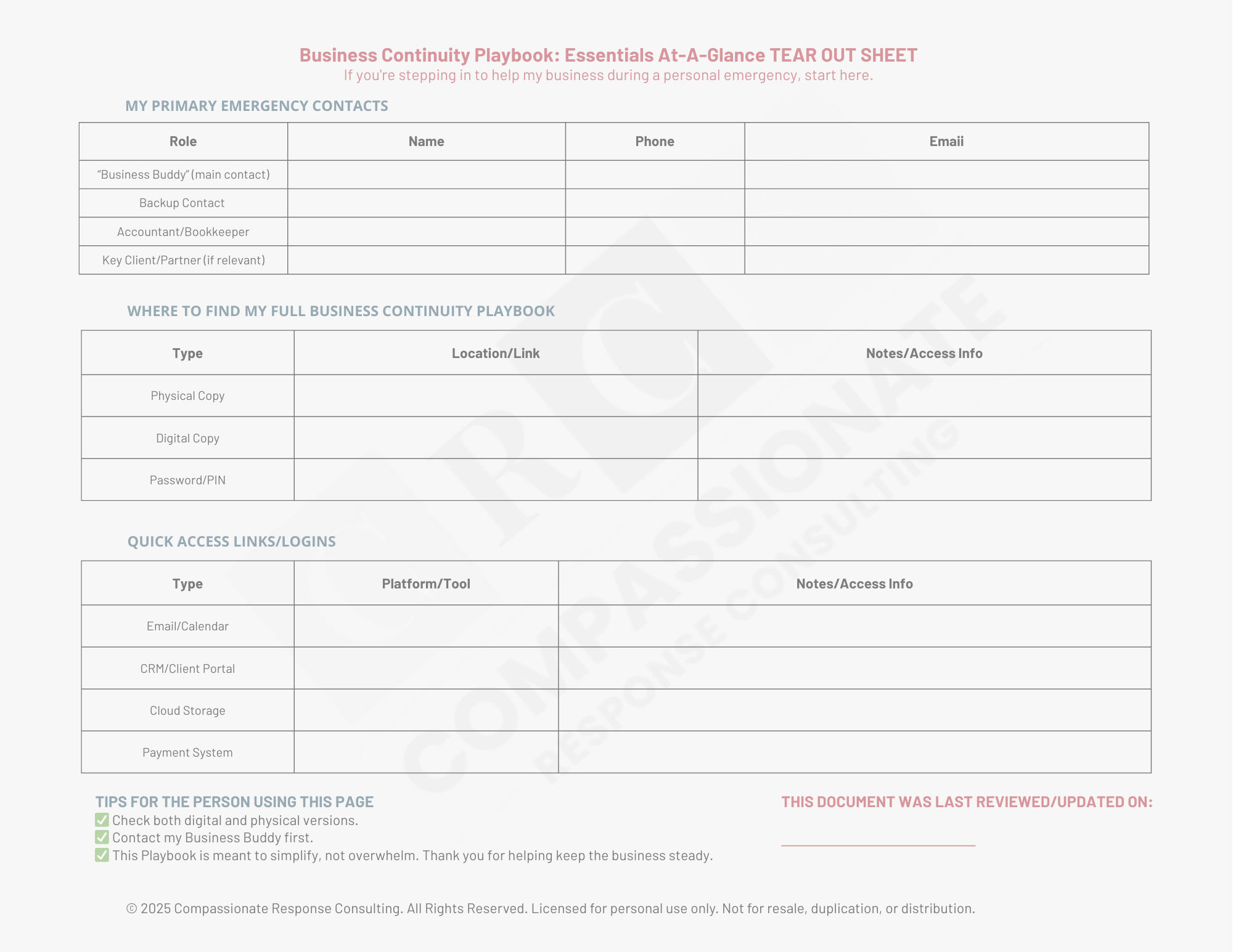 The CRC Business Continuity Playbook gives solopreneurs, fractionals, and small-team leaders a complete operating backup system: organized, fillable, and simple enough to update anytime life throws a curveball.
