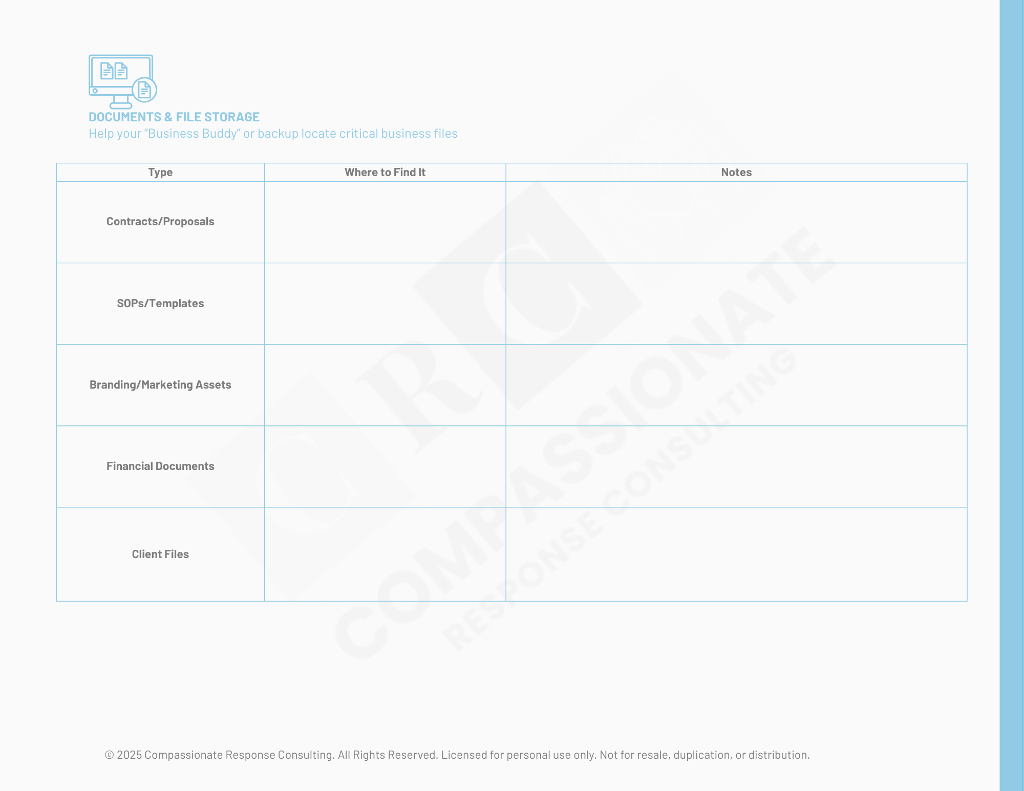 This section makes it simple to record where contracts, proposals, financial documents, templates, and client files actually live, so nothing gets lost in an emergency. Whether you store everything digitally, physically, or both, these fillable layouts give your Business Buddy a clear map of what matters and where to find it.